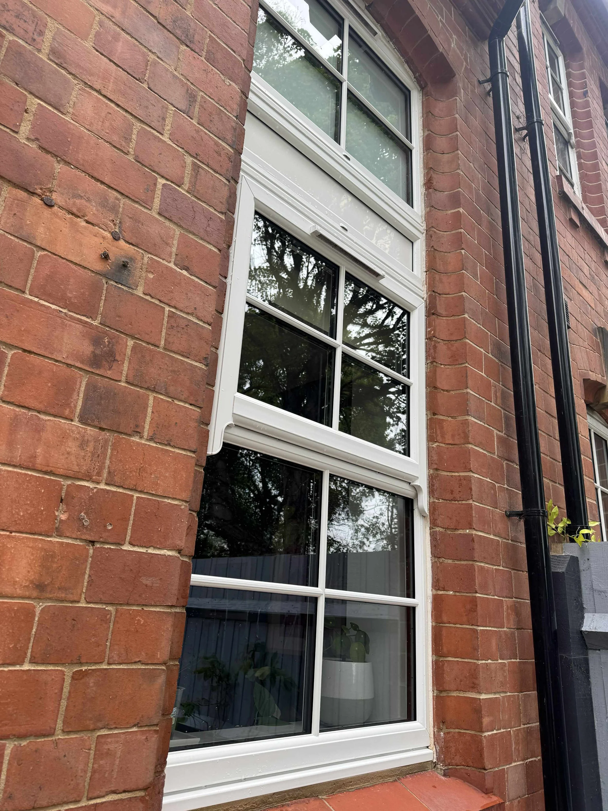 Comparison of two houses with brick facades and multiple windows; the house on the top has older, traditional windows, while the house on the bottom shows new, modern black-framed windows and siding.
