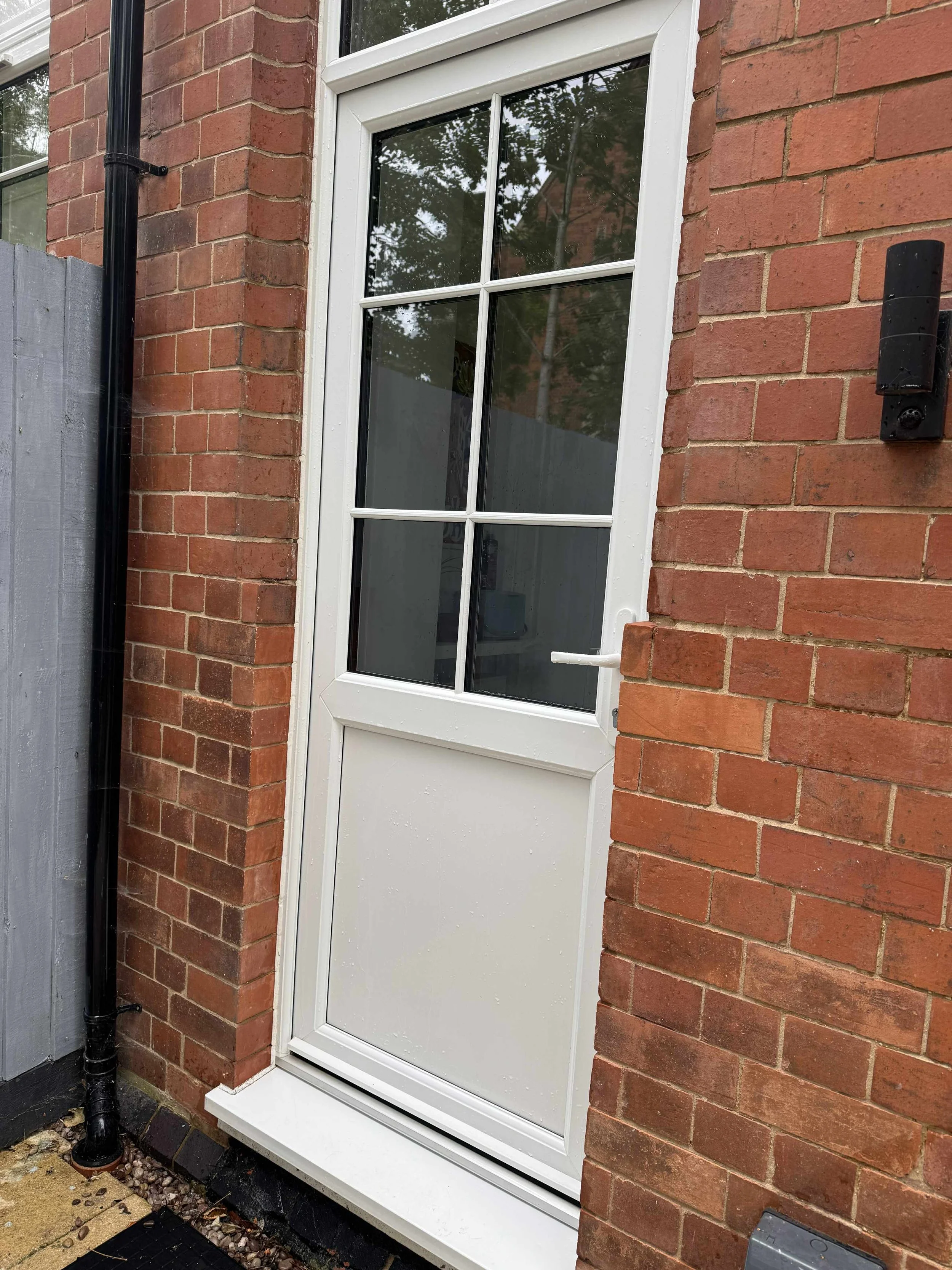 Close-up view of the exterior of a brick house showing windows, a white door, and a black gutter system against a clear blue sky.